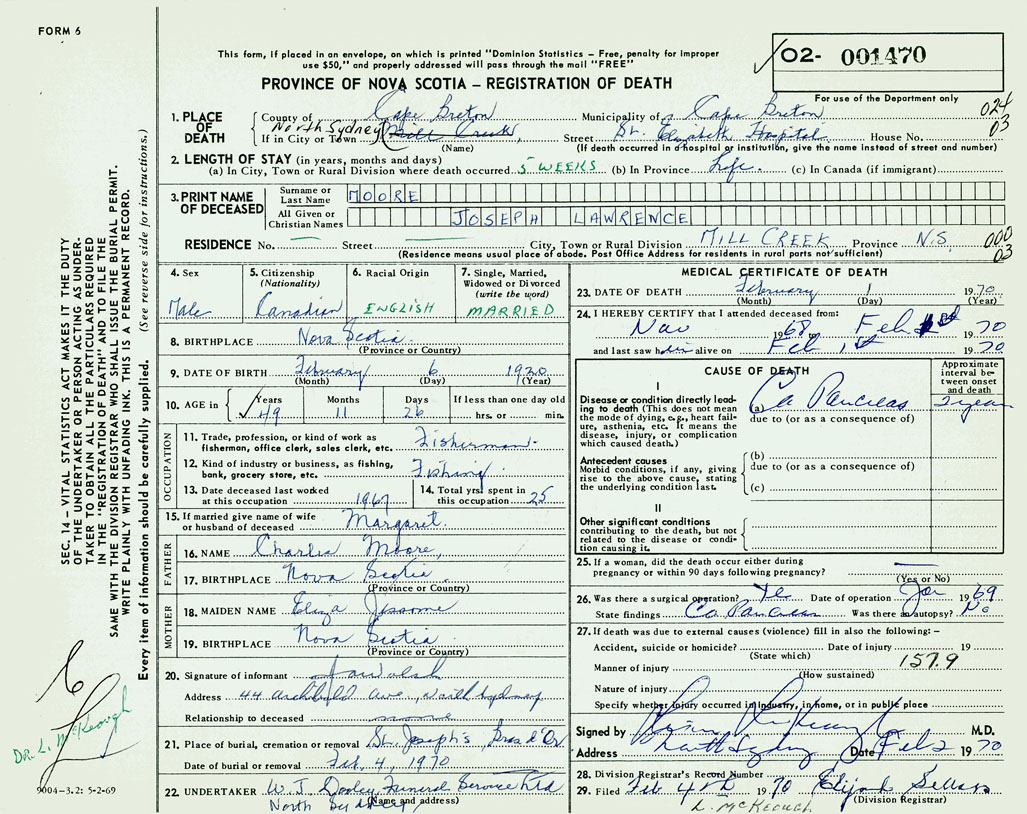 PROVINCE OF NOVA SCOTIA — REGISTRATION OF DEATH