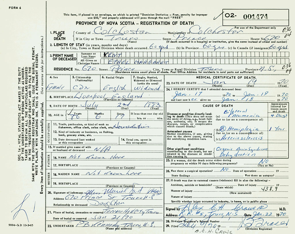 PROVINCE OF NOVA SCOTIA — REGISTRATION OF DEATH