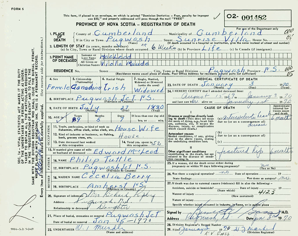 1. PLACE OF DEATH County of Cumberland If in City or Town Pugwash