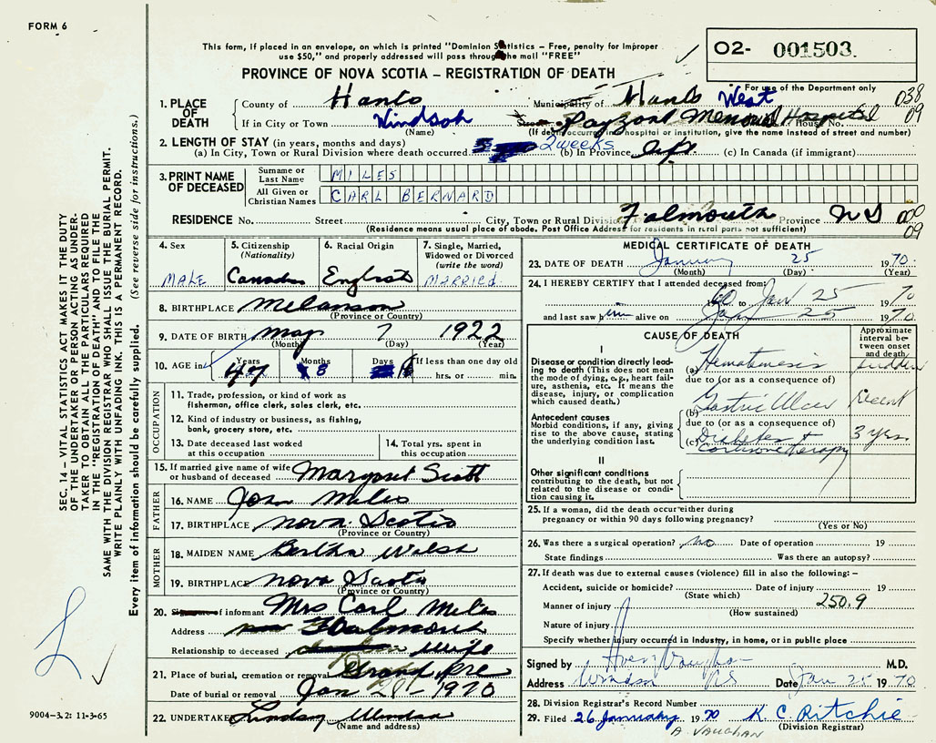 1. PLACE OF DEATH County of Hants If in City or Town Windsor