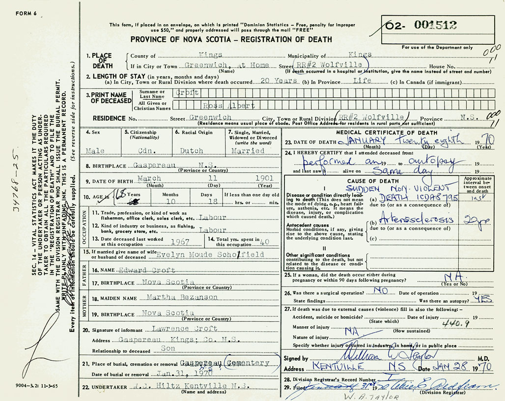 PROVINCE OF NOVA SCOTIA — REGISTRATION OF DEATH