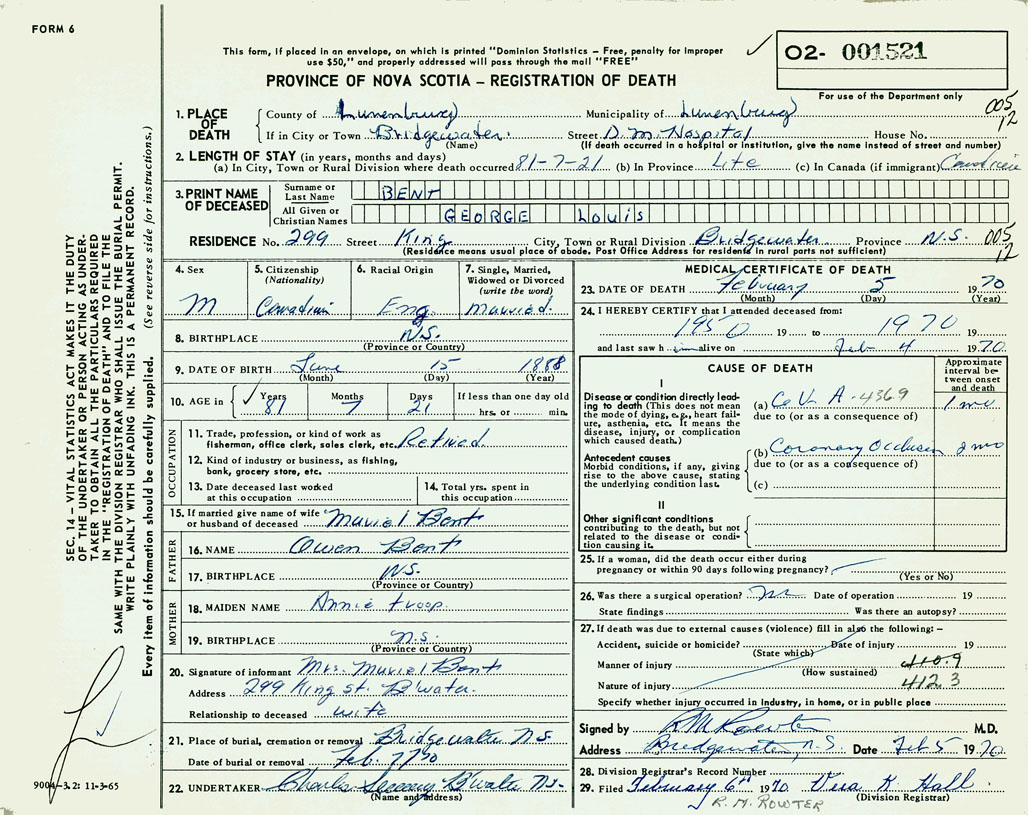 PROVINCE OF NOVA SCOTIA — REGISTRATION OF DEATH