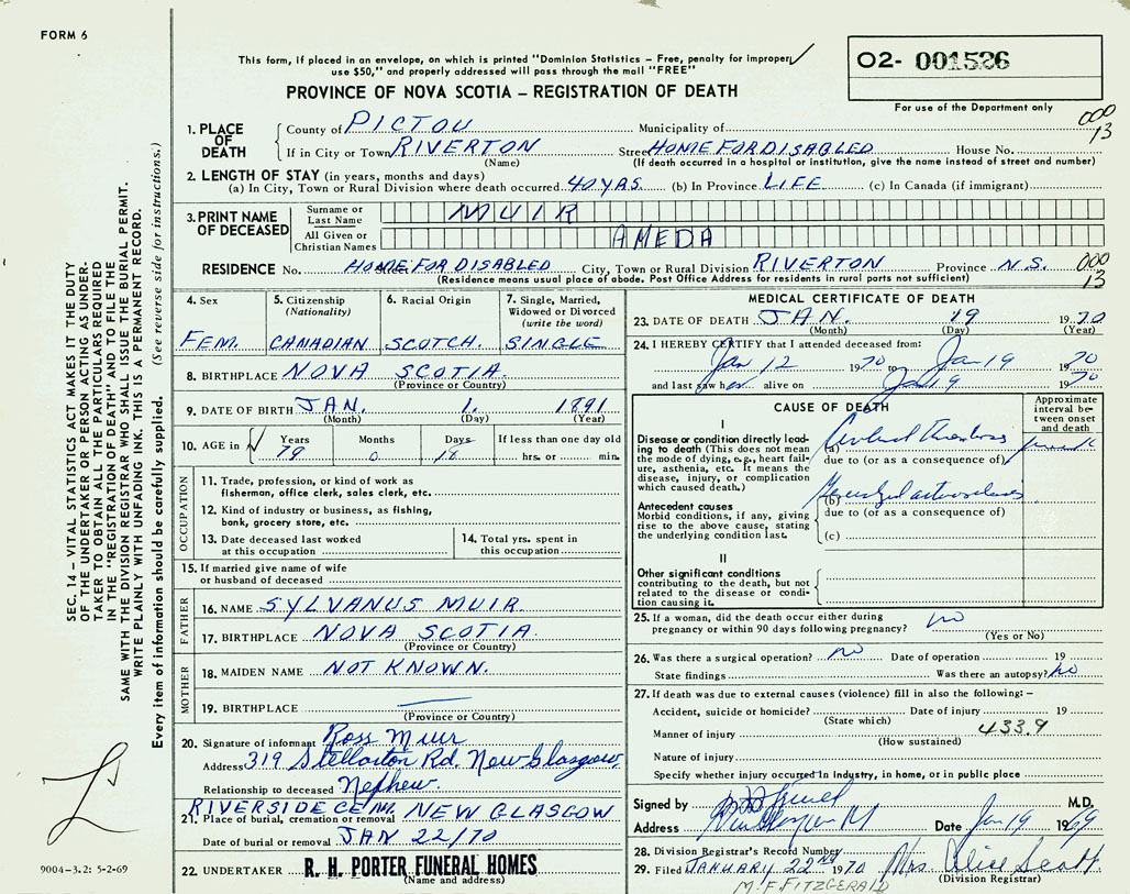 1. PLACE OF DEATH County of Pictou If in City or Town Riverton