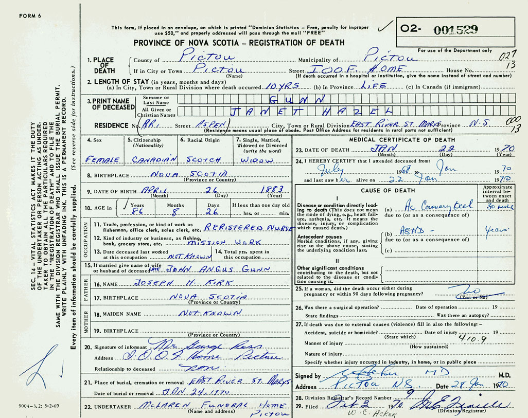 1. PLACE OF DEATH County of Pictou If in City or Town Pictou