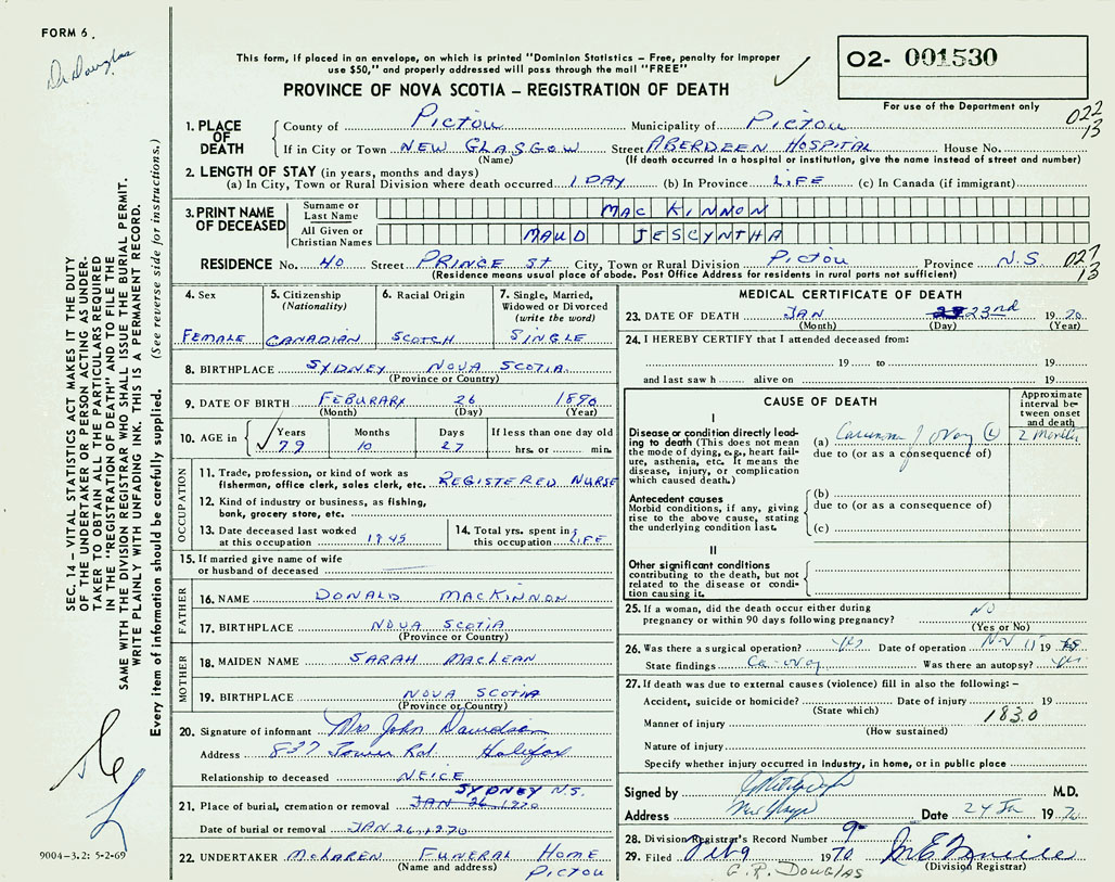 PROVINCE OF NOVA SCOTIA — REGISTRATION OF DEATH