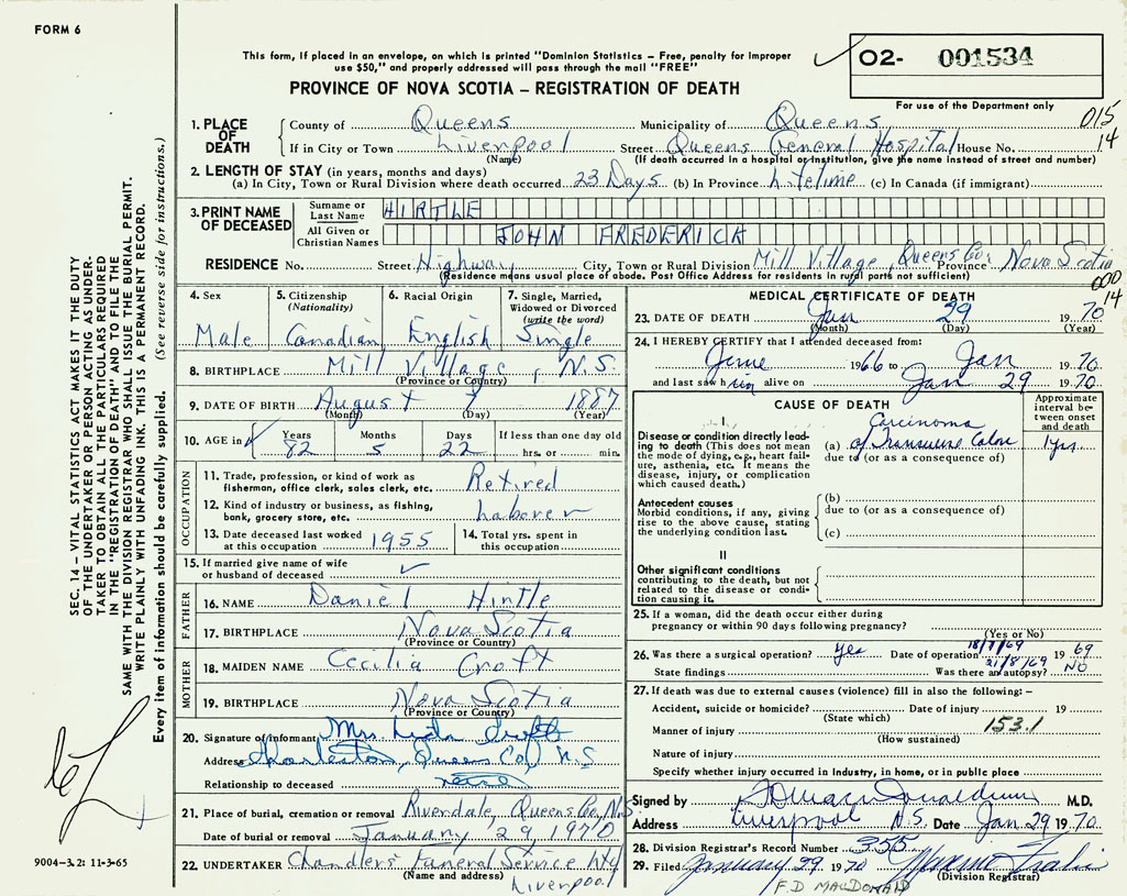 PROVINCE OF NOVA SCOTIA — REGISTRATION OF DEATH