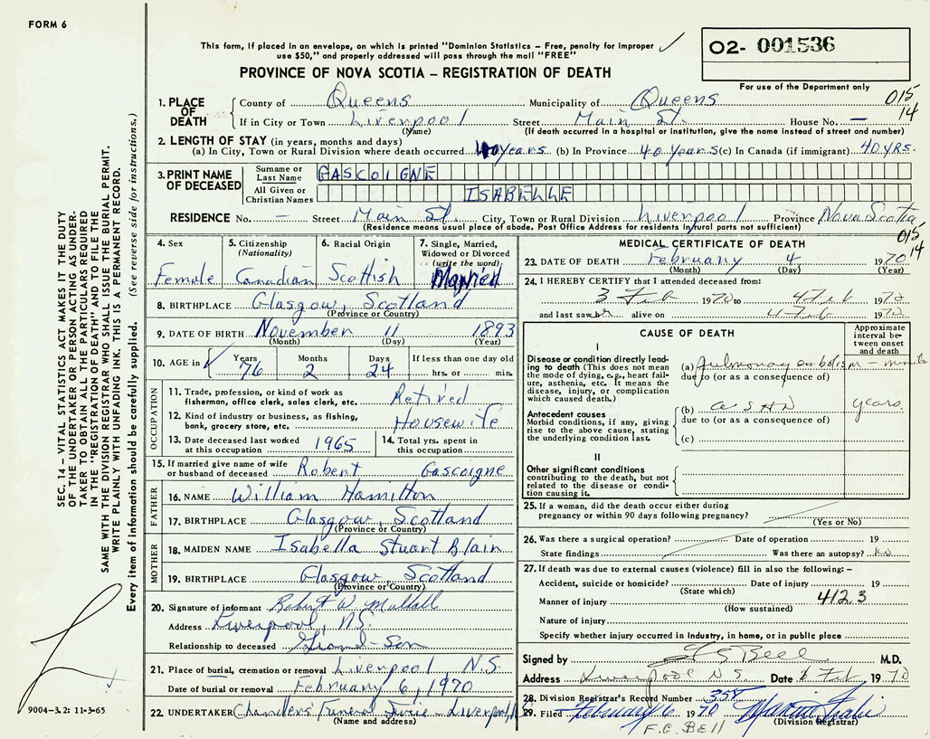 PROVINCE OF NOVA SCOTIA — REGISTRATION OF DEATH