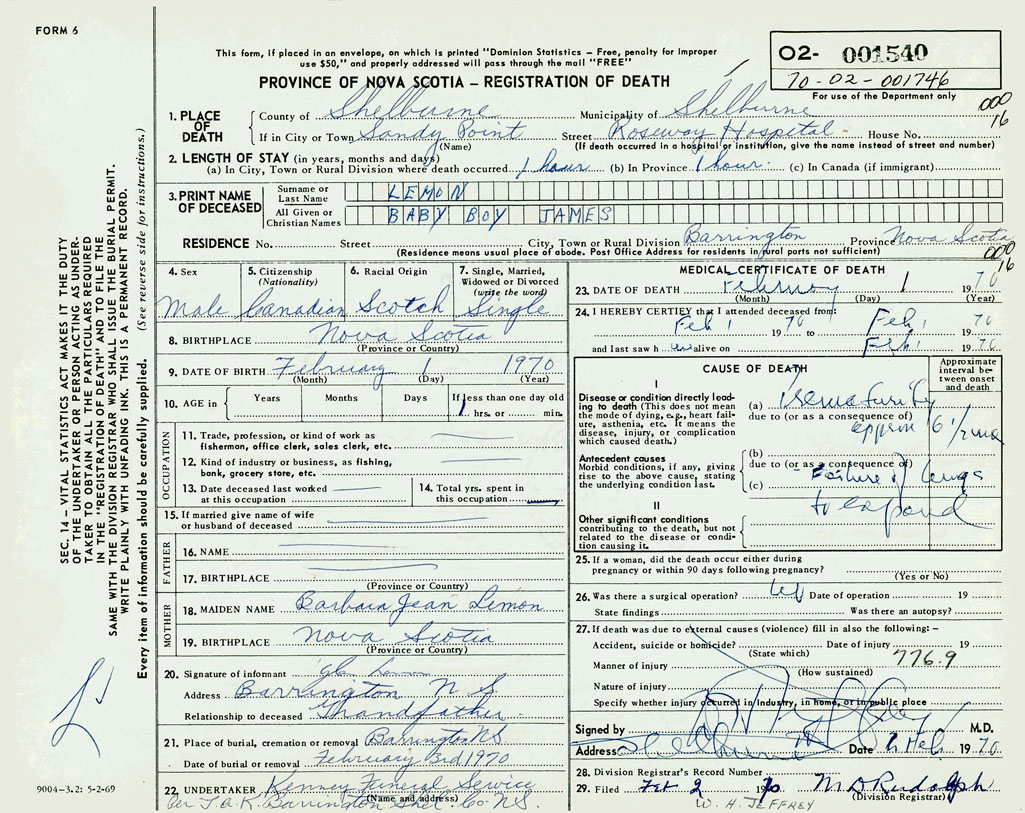 1. PLACE OF DEATH County of Shelburne If in City or Town Sandy Point