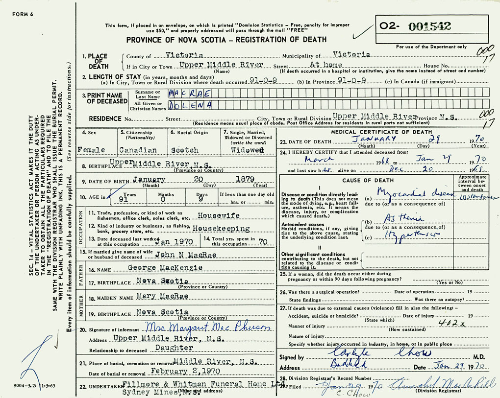 PROVINCE OF NOVA SCOTIA — REGISTRATION OF DEATH