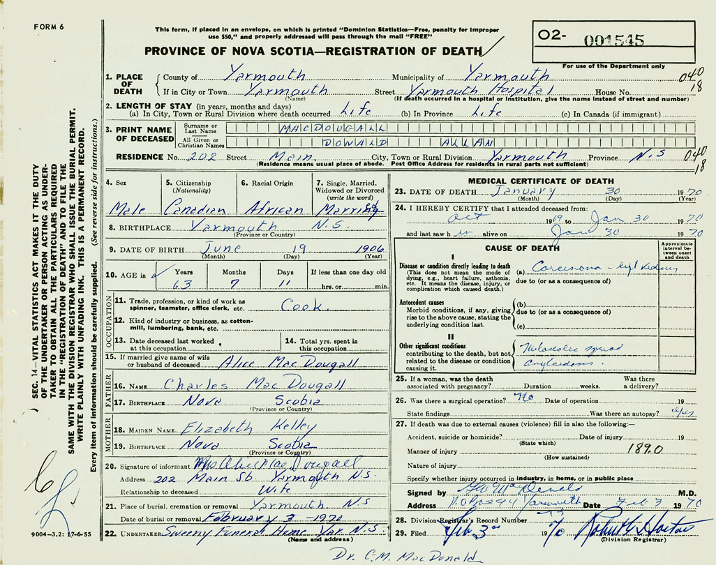 PROVINCE OF NOVA SCOTIA — REGISTRATION OF DEATH