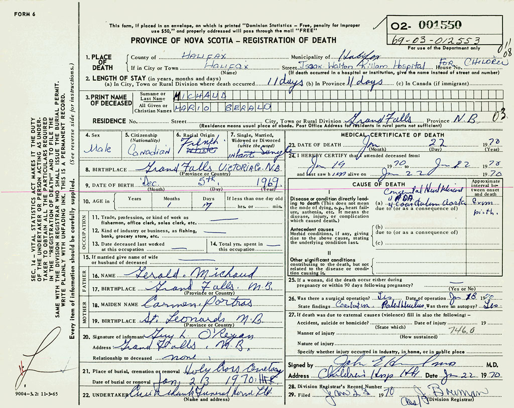 If death occured in a hospital or institution IWK Hospital Halifax