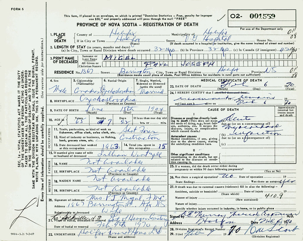 PROVINCE OF NOVA SCOTIA — REGISTRATION OF DEATH