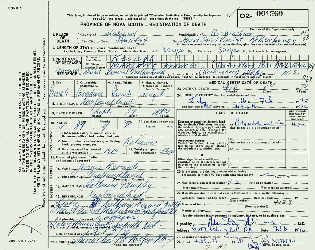 3. PRINT NAME OF DECEASED Keough, Margaret Frances (Sister Mary Paschal Keough)