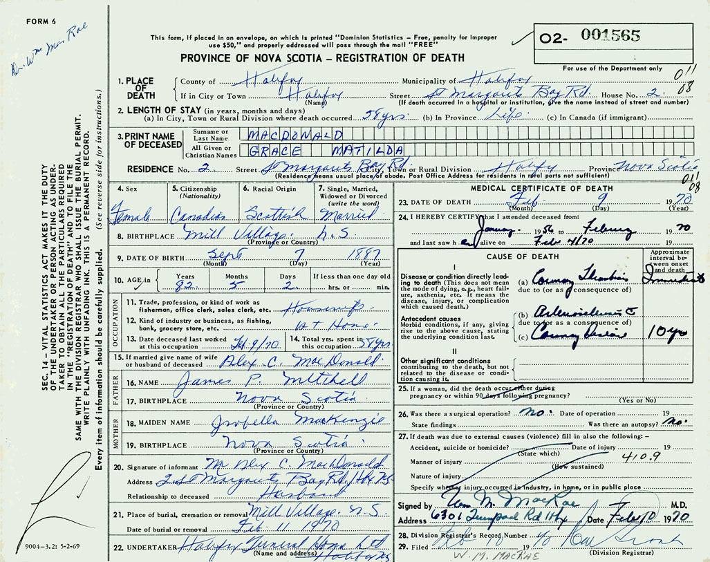 PROVINCE OF NOVA SCOTIA — REGISTRATION OF DEATH