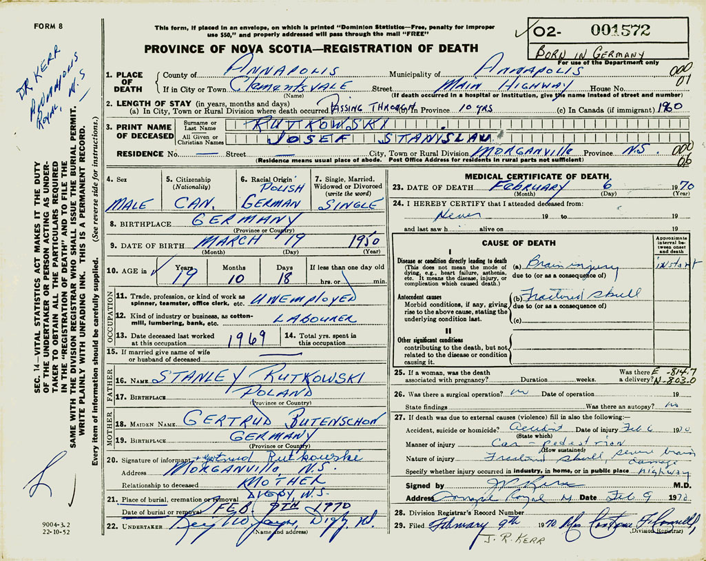 PROVINCE OF NOVA SCOTIA — REGISTRATION OF DEATH