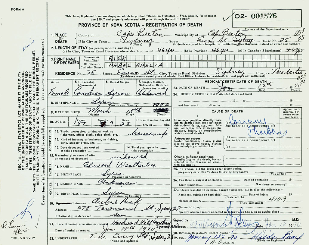 1. PLACE OF DEATH County of Cape Breton If in City or Town Sydney