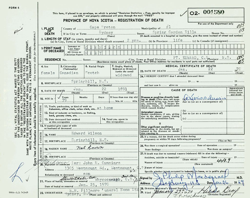 1. PLACE OF DEATH County of Cape Breton If in City or Town Sydney
