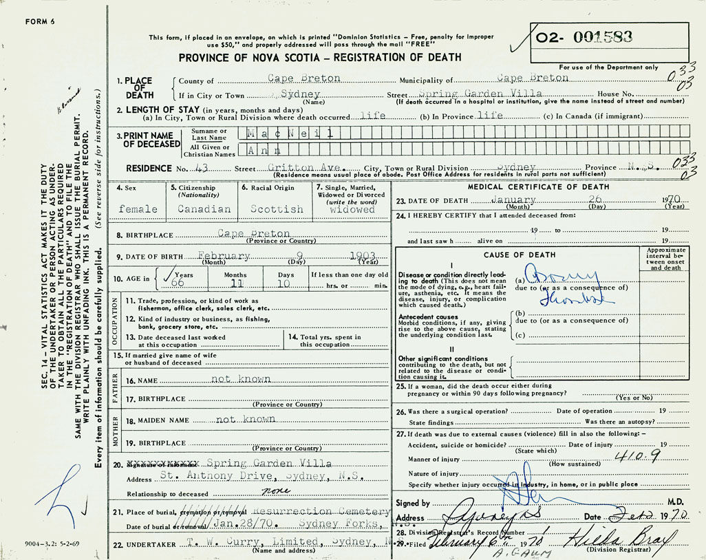 1. PLACE OF DEATH County of Cape Breton If in City or Town Sydney