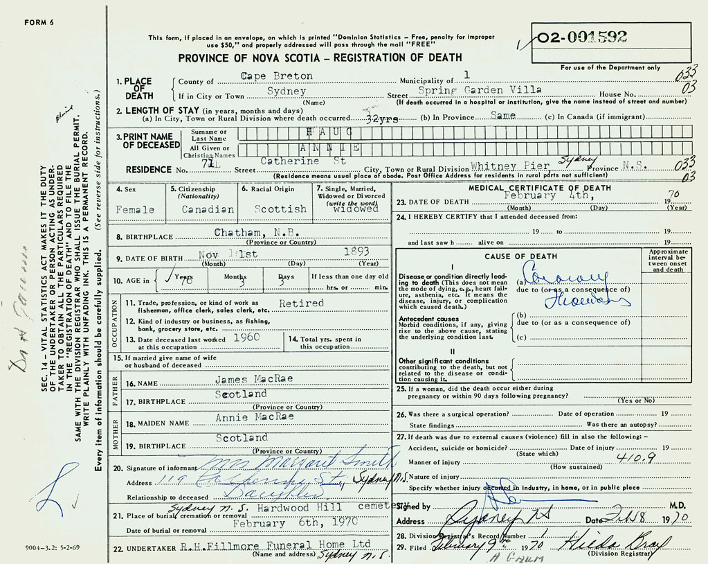 1. PLACE OF DEATH County of Cape Breton If in City or Town Sydney