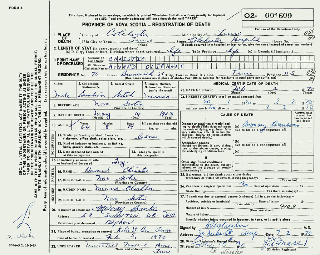 PROVINCE OF NOVA SCOTIA — REGISTRATION OF DEATH