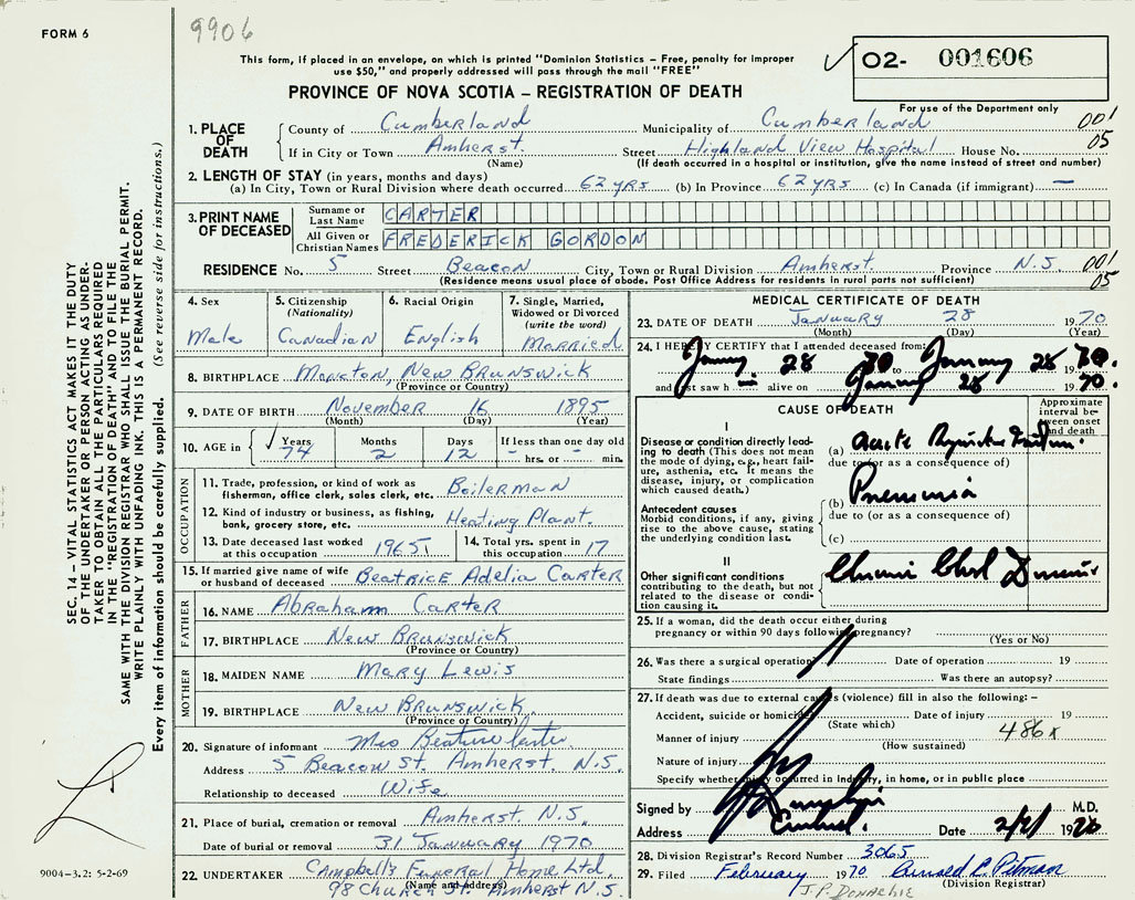PROVINCE OF NOVA SCOTIA — REGISTRATION OF DEATH