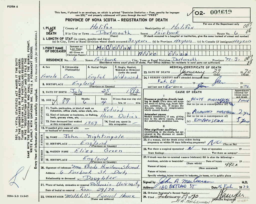 PROVINCE OF NOVA SCOTIA — REGISTRATION OF DEATH