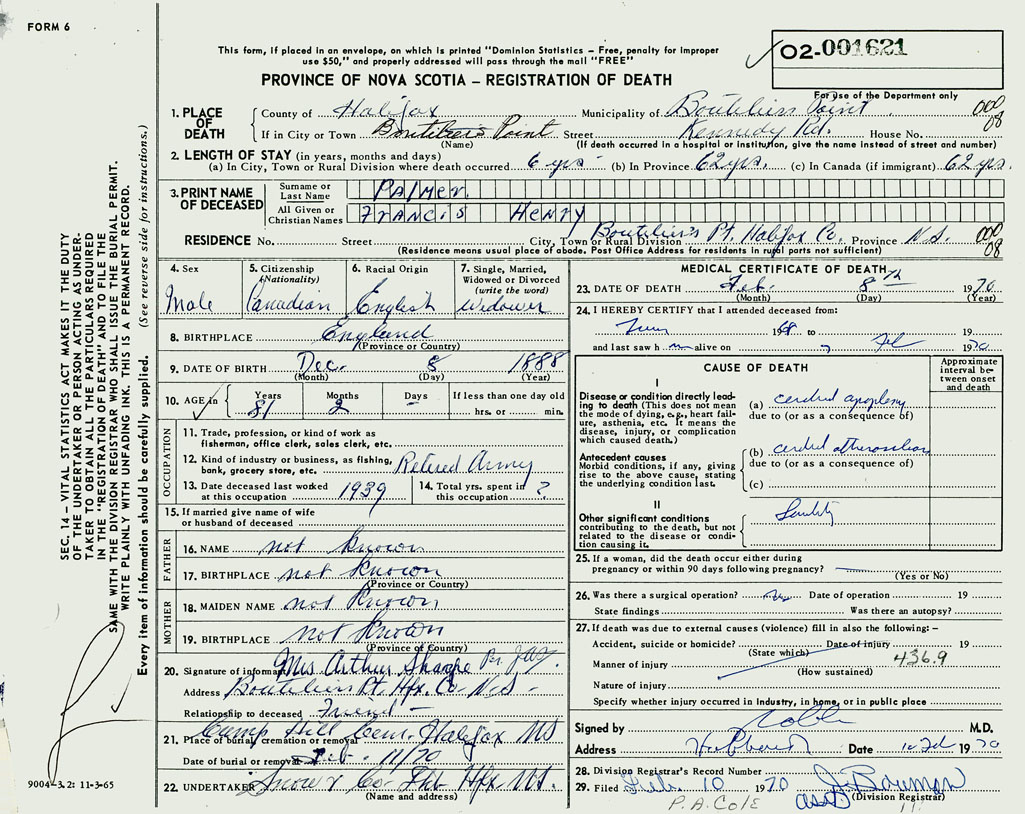 PROVINCE OF NOVA SCOTIA — REGISTRATION OF DEATH