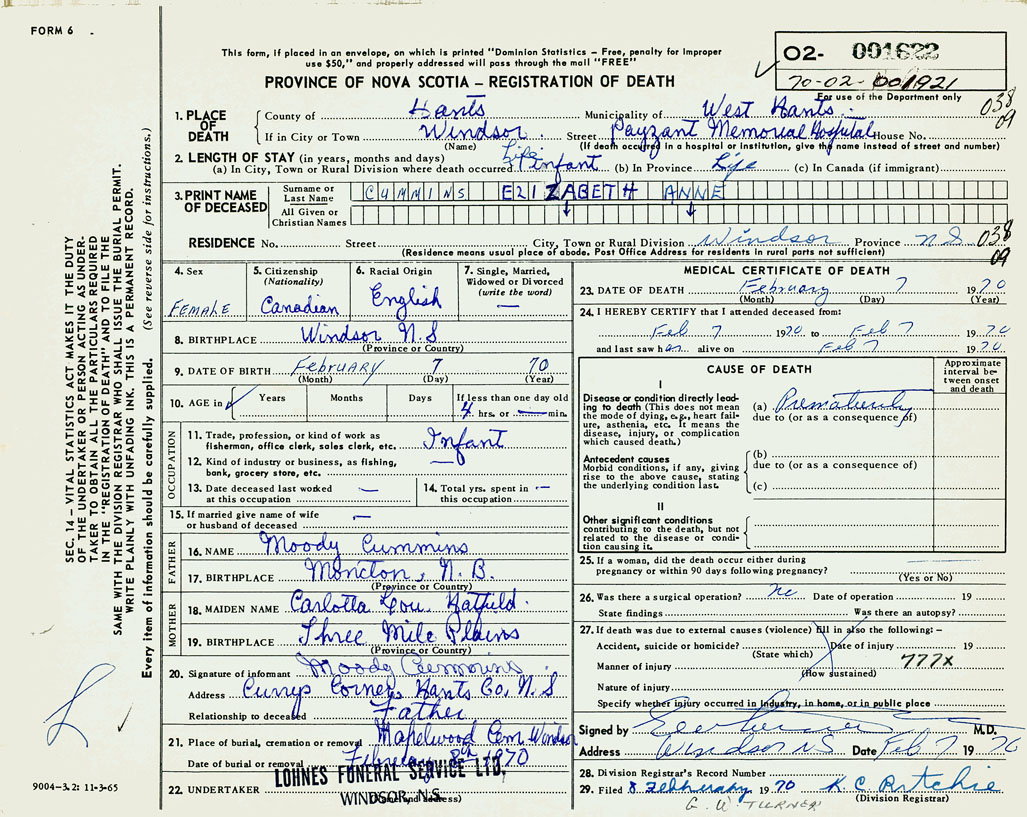 1. PLACE OF DEATH County of Hants If in City or Town Windsor