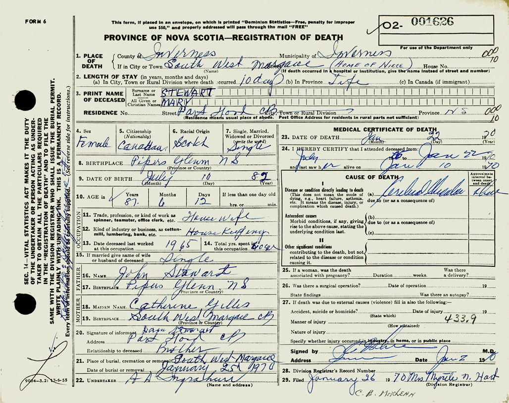 PROVINCE OF NOVA SCOTIA — REGISTRATION OF DEATH