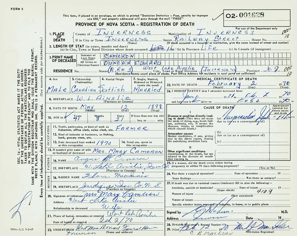 PROVINCE OF NOVA SCOTIA — REGISTRATION OF DEATH
