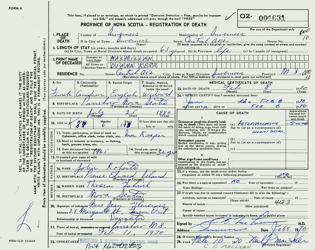 PROVINCE OF NOVA SCOTIA — REGISTRATION OF DEATH