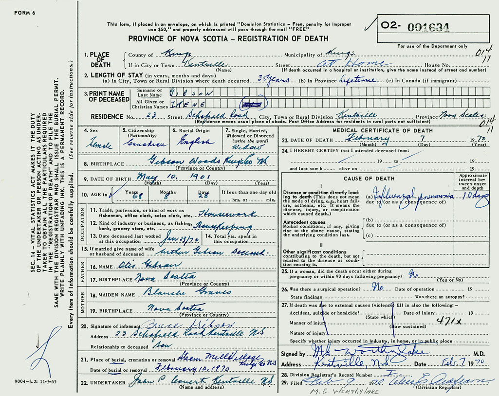 1. PLACE OF DEATH County of Kings If in City or Town Kentville