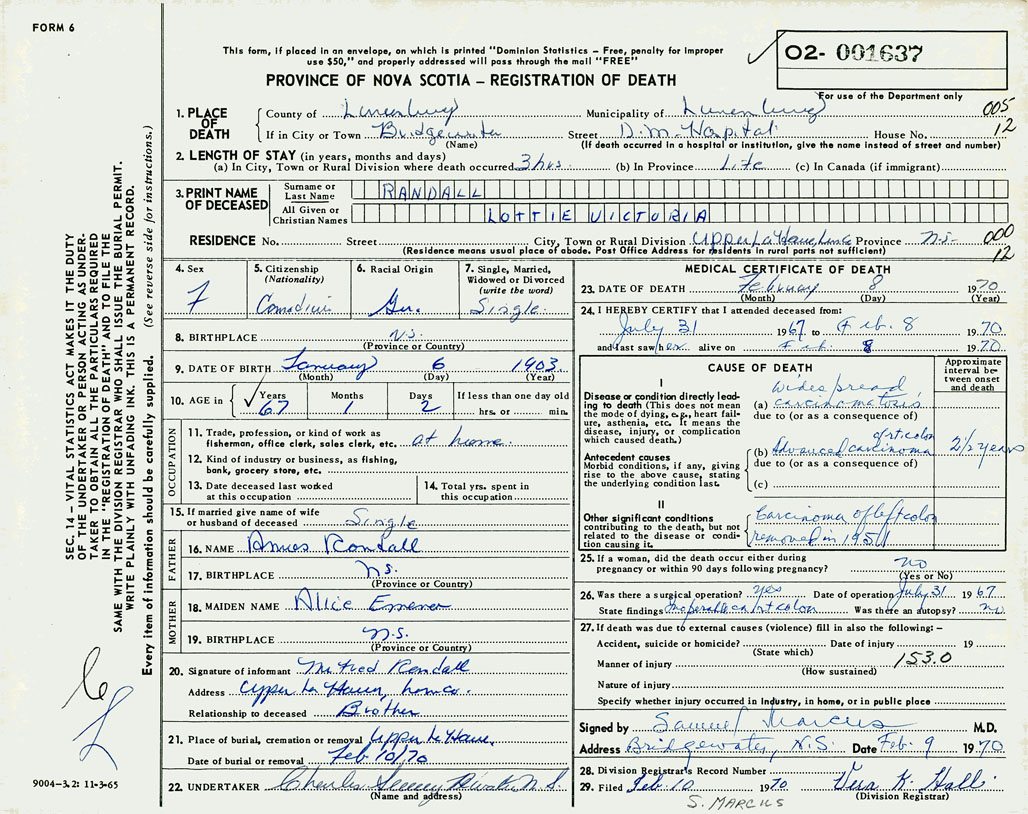 PROVINCE OF NOVA SCOTIA — REGISTRATION OF DEATH