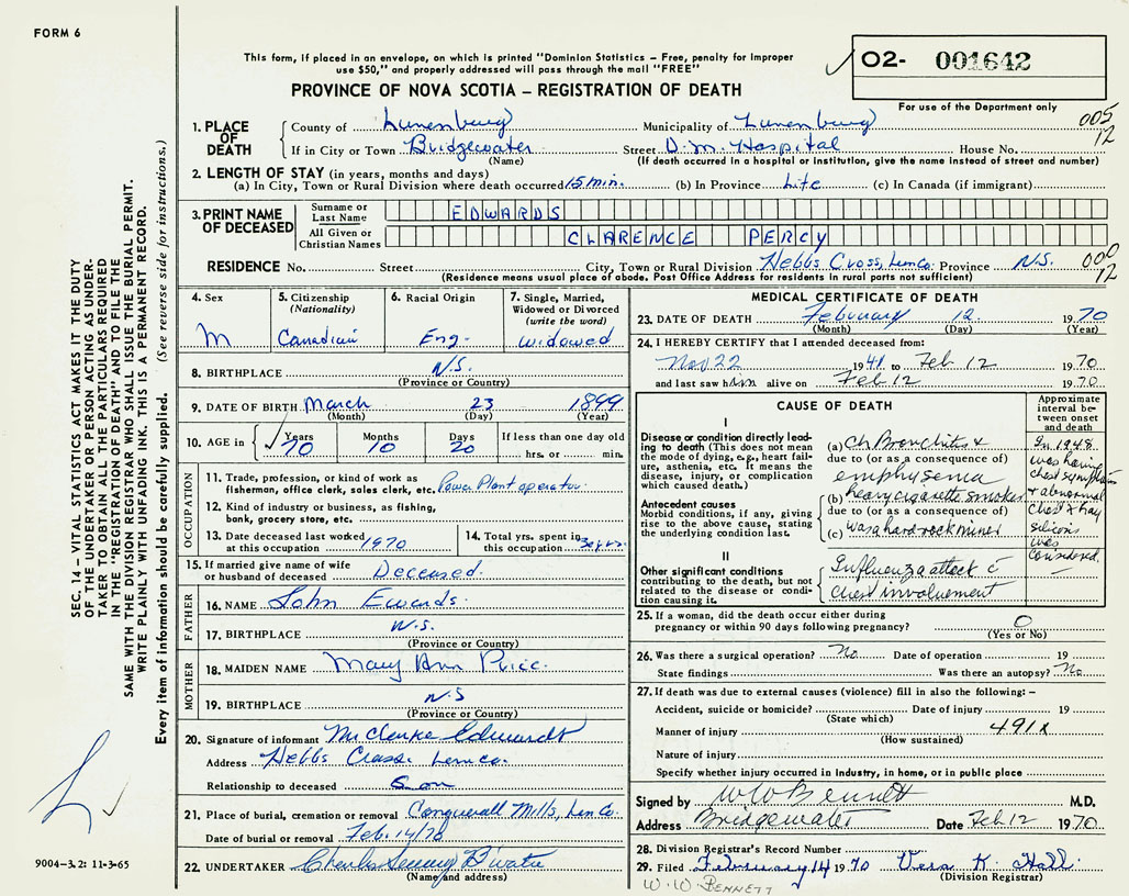 1. PLACE OF DEATH County of Lunenburg If in City or Town Bridgewater