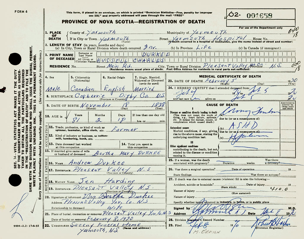 PROVINCE OF NOVA SCOTIA — REGISTRATION OF DEATH