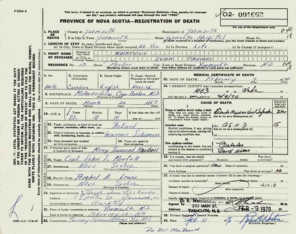 PROVINCE OF NOVA SCOTIA — REGISTRATION OF DEATH