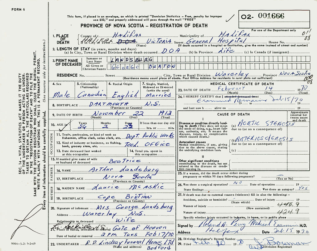 PROVINCE OF NOVA SCOTIA — REGISTRATION OF DEATH