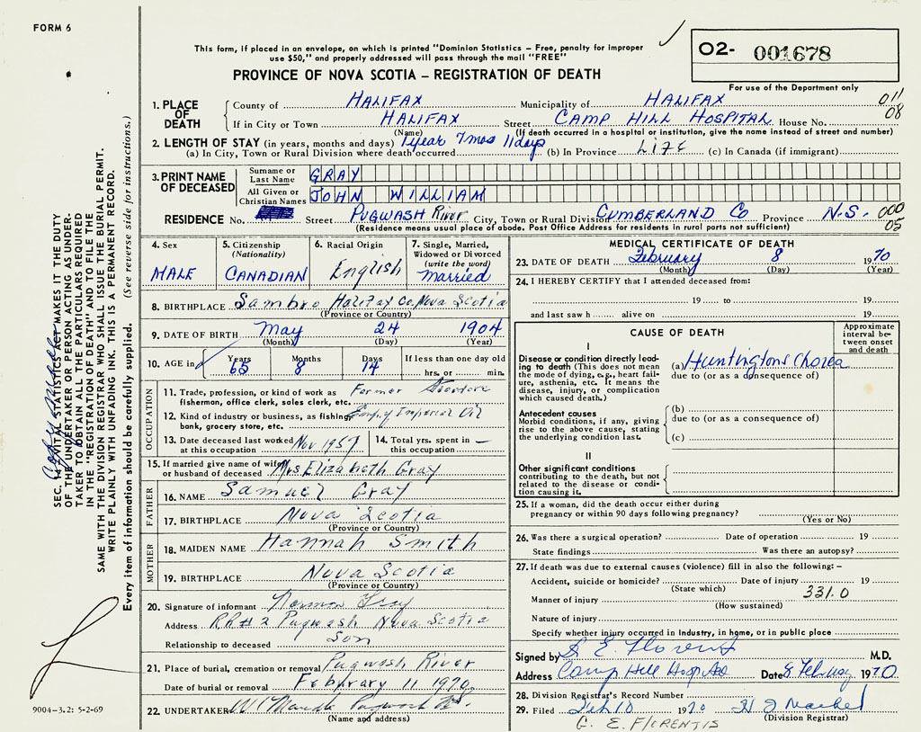 PROVINCE OF NOVA SCOTIA — REGISTRATION OF DEATH