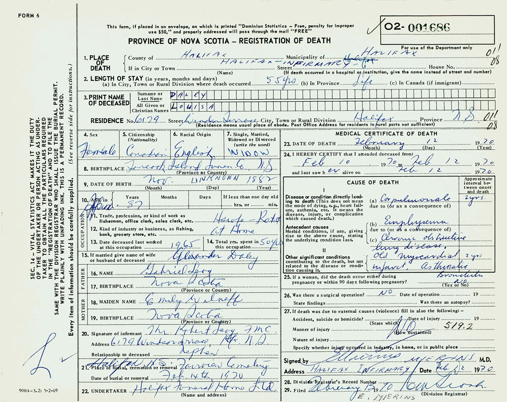 PROVINCE OF NOVA SCOTIA — REGISTRATION OF DEATH