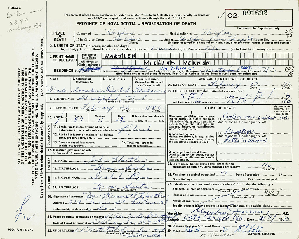 PROVINCE OF NOVA SCOTIA — REGISTRATION OF DEATH