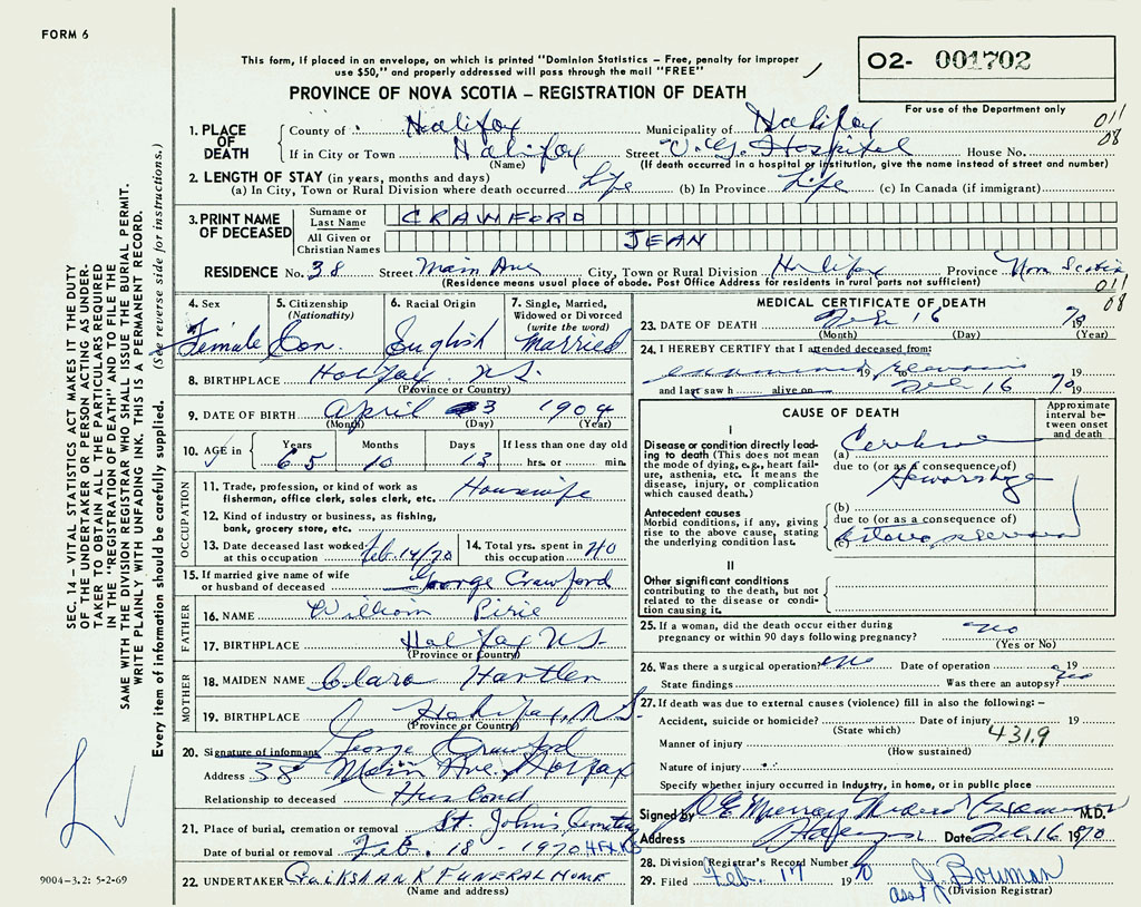 PROVINCE OF NOVA SCOTIA — REGISTRATION OF DEATH