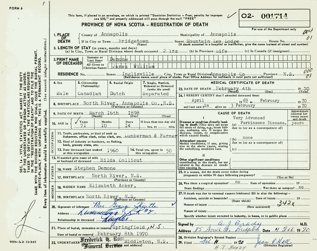 PROVINCE OF NOVA SCOTIA — REGISTRATION OF DEATH