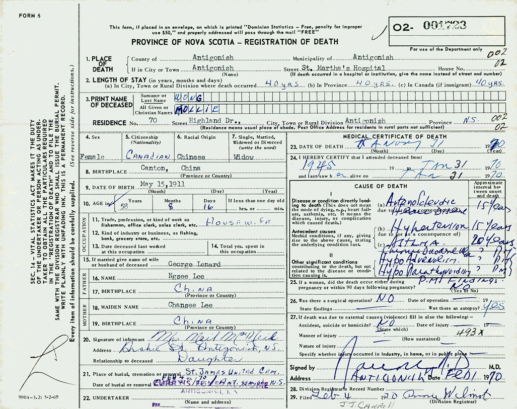 1. PLACE OF DEATH County of Antigonish If in City or Town Antigonish