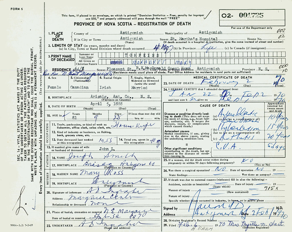 1. PLACE OF DEATH County of Antigonish If in City or Town Antigonish