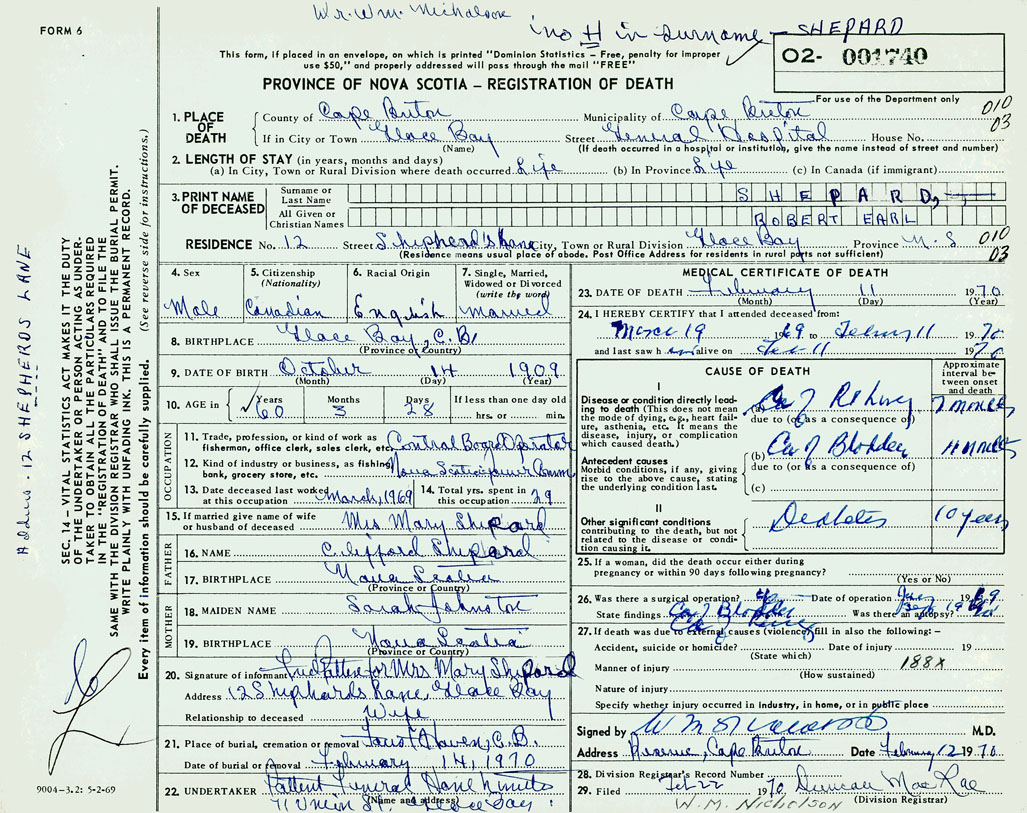 PROVINCE OF NOVA SCOTIA — REGISTRATION OF DEATH