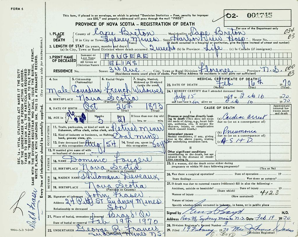 1. PLACE OF DEATH County of Cape Breton If in City or Town Sydney Mines