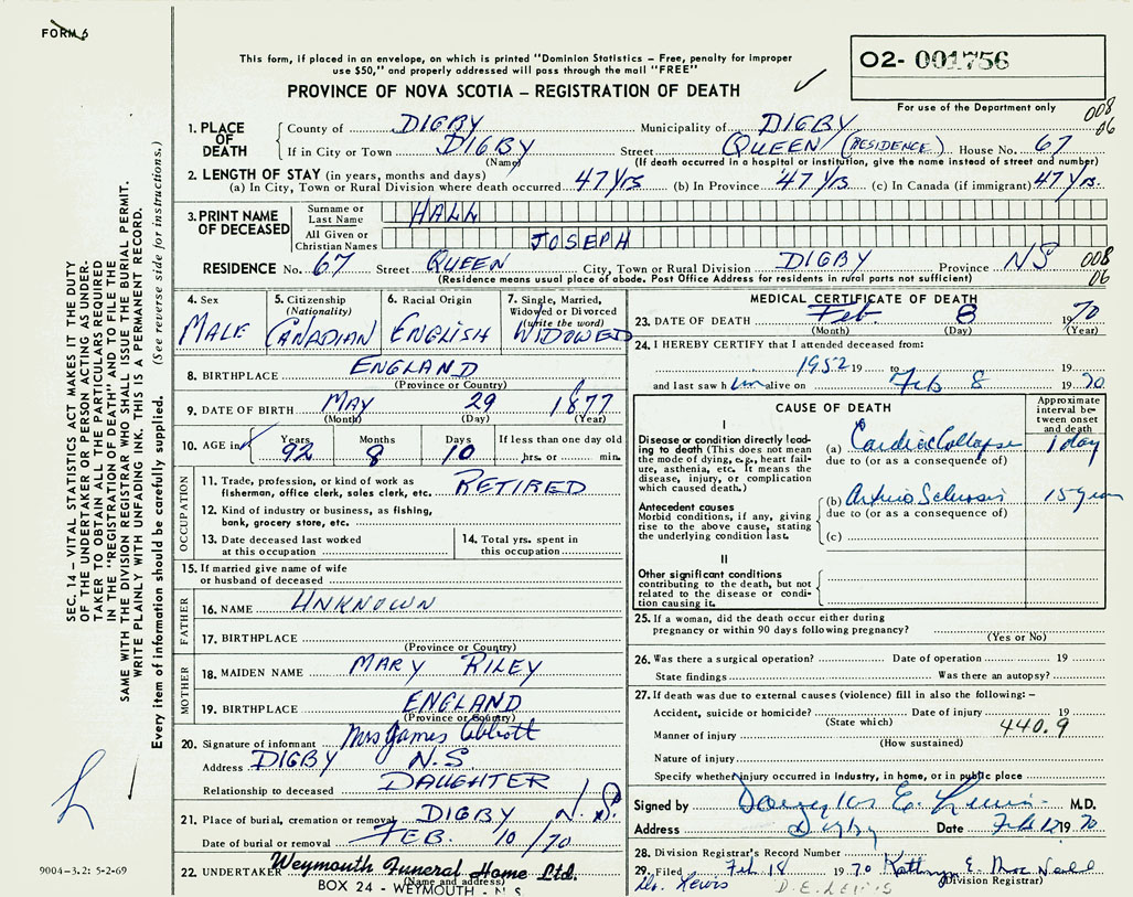 PROVINCE OF NOVA SCOTIA — REGISTRATION OF DEATH