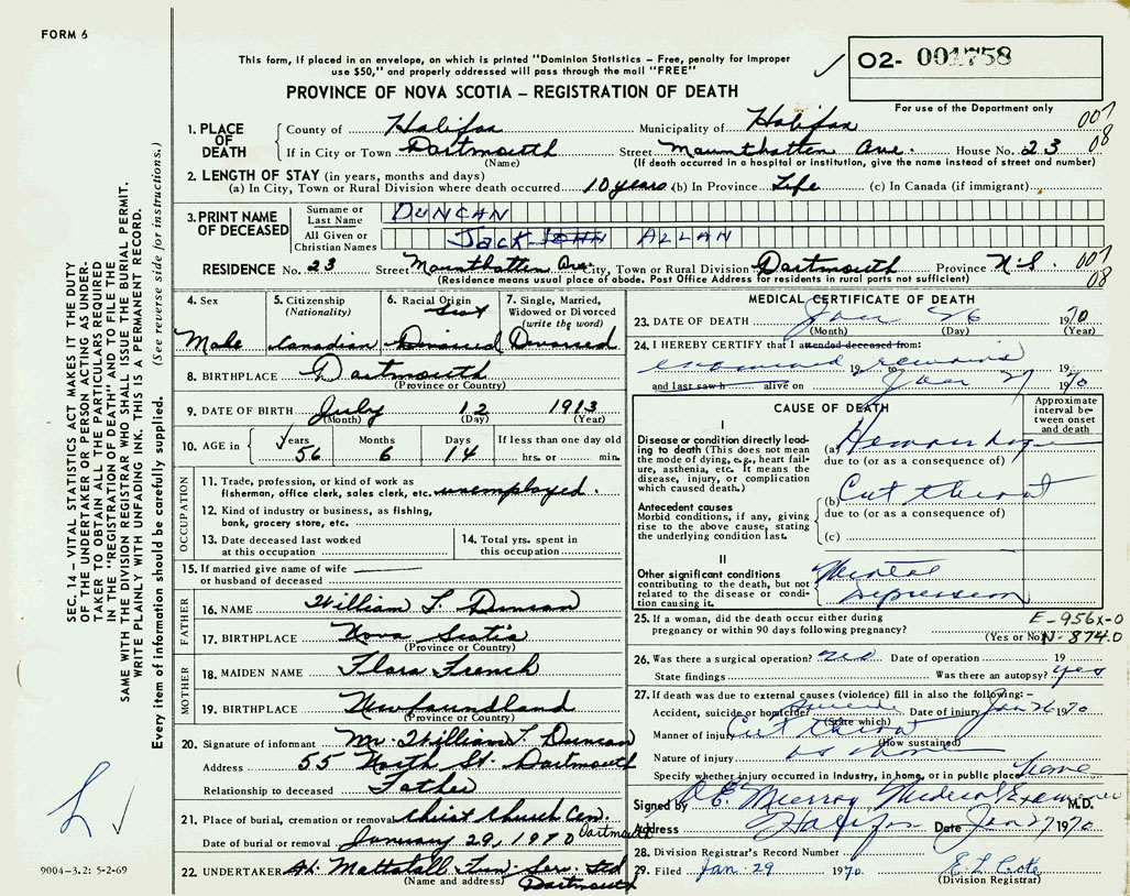 PROVINCE OF NOVA SCOTIA — REGISTRATION OF DEATH
