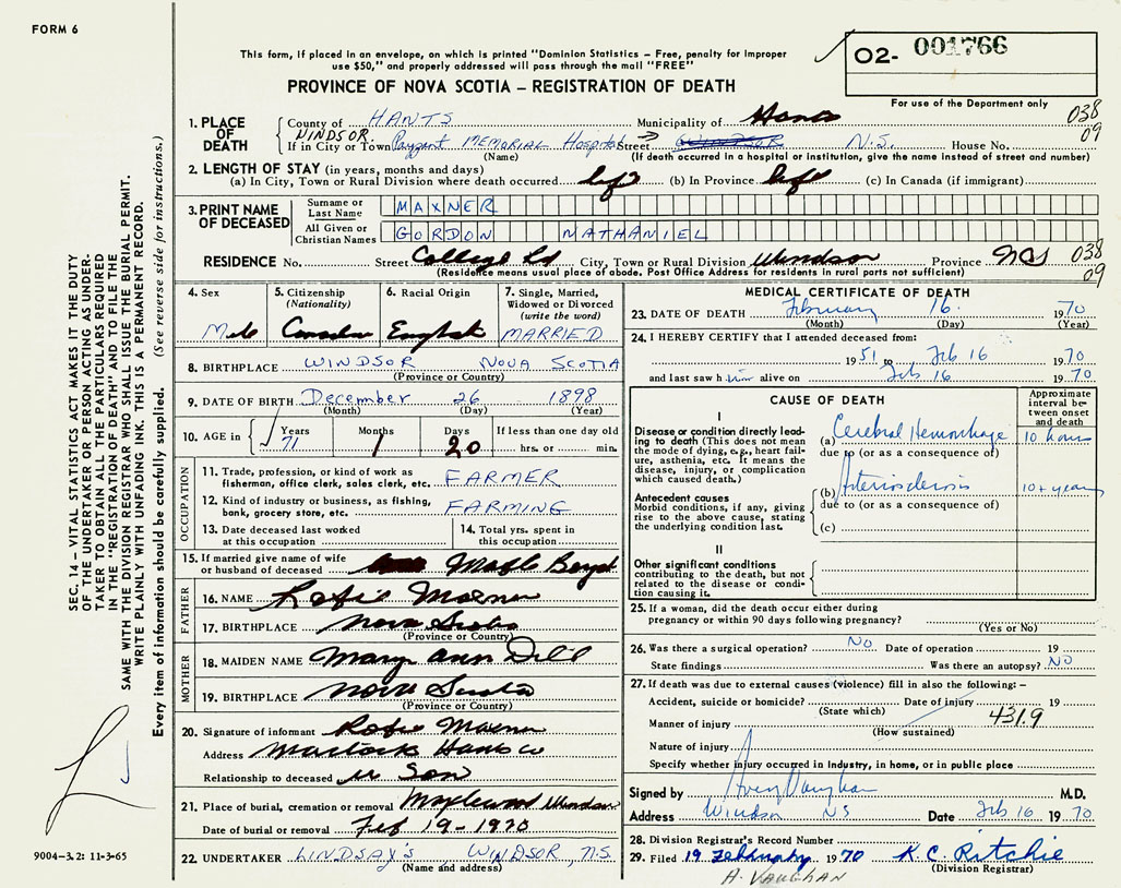 PROVINCE OF NOVA SCOTIA — REGISTRATION OF DEATH
