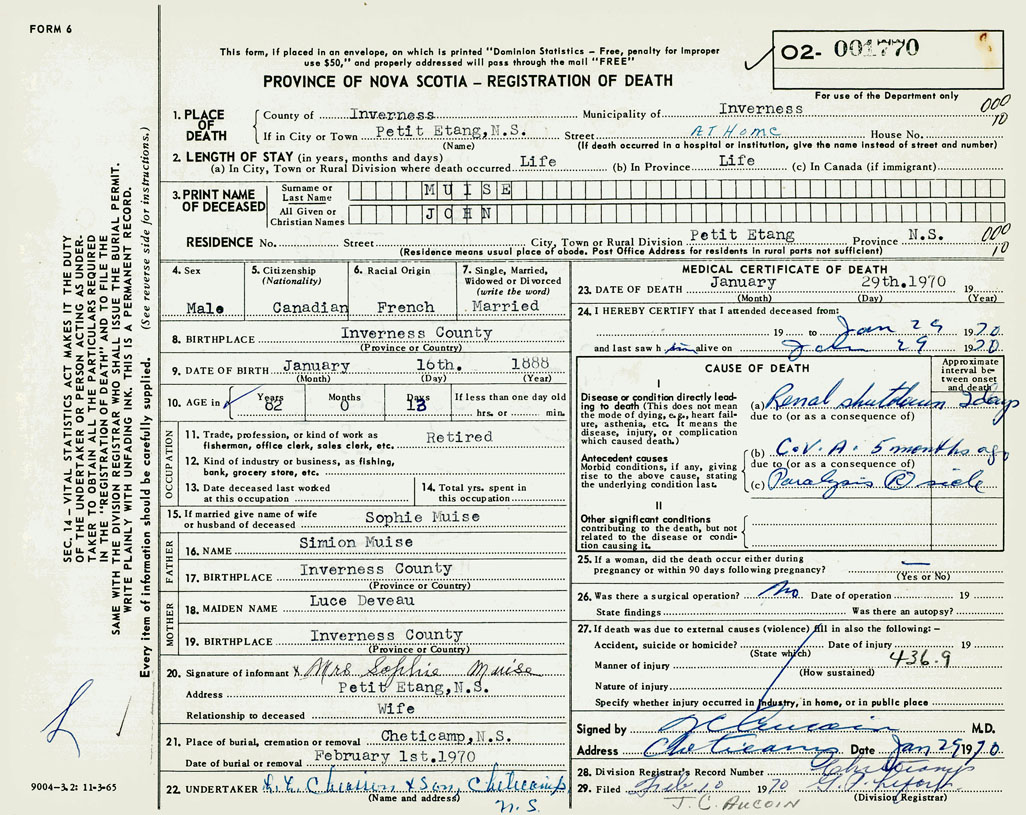 PROVINCE OF NOVA SCOTIA — REGISTRATION OF DEATH